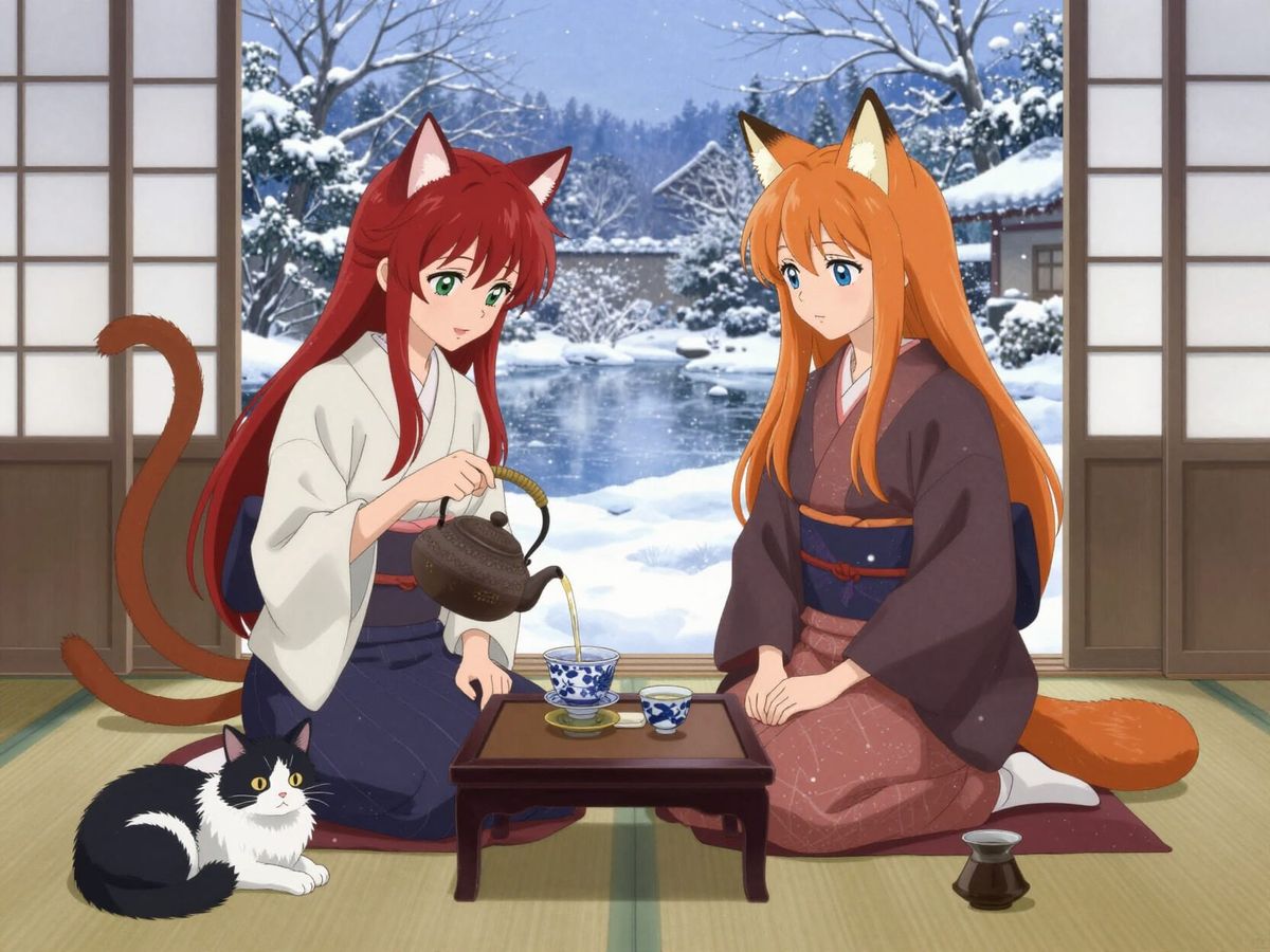 This anime illustration features two women with animal ears enjoying tea in a serene winter garden teahouse. Snow falls gently, creating a peaceful atmosphere.