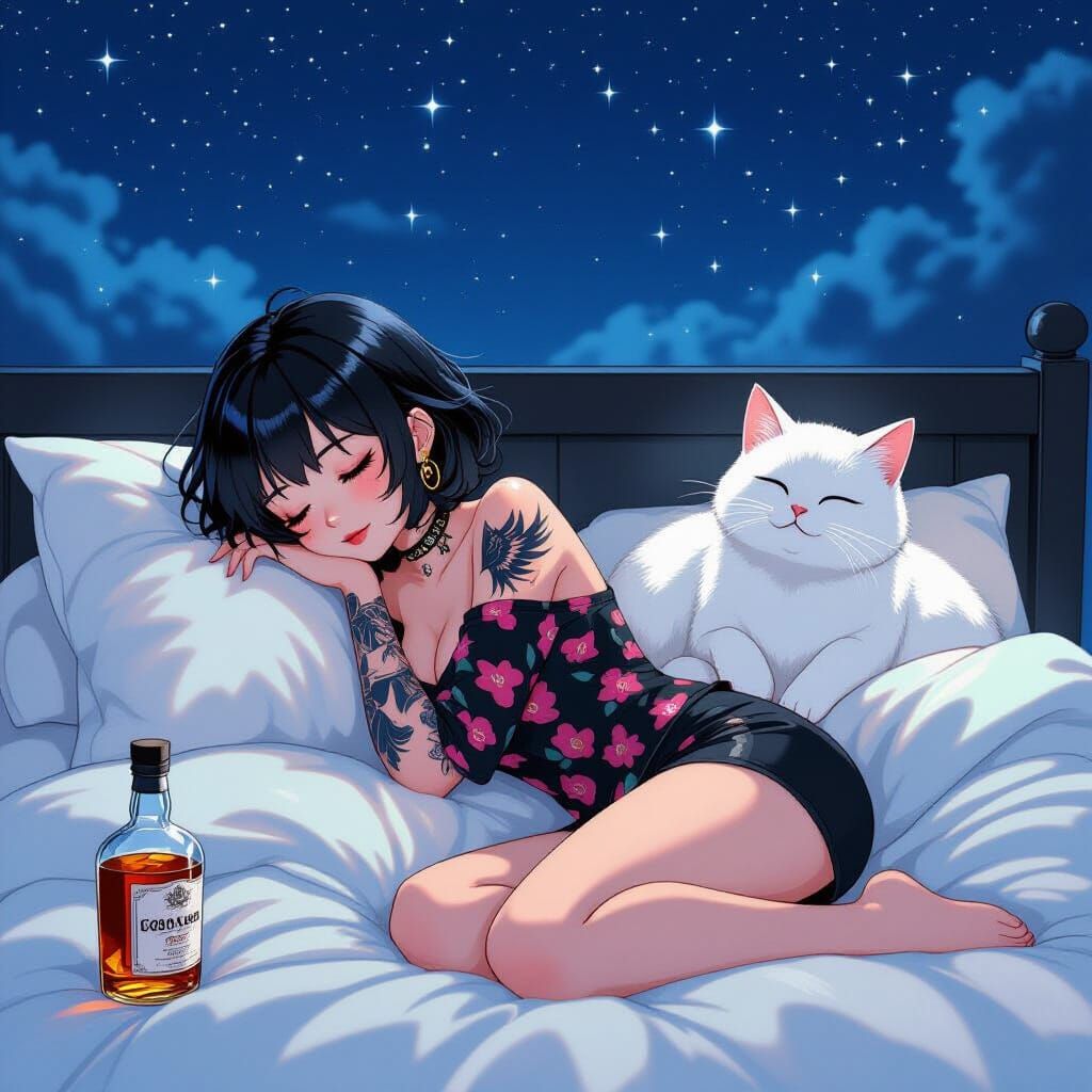 This image shows a young woman with black hair and wing tattoos asleep in bed with a large white cat. The scene is rendered in an anime style with high-quality, cinematic lighting and deep colors.