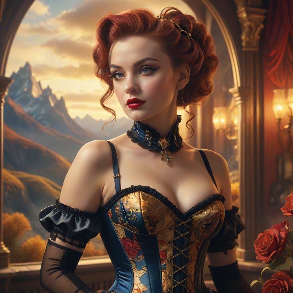 A striking picture of a woman whose face blends seamlessly into a vibrant landscape. She wears elegant stockings and a burlesque corset, all rendered as detailed, intricate digital art.