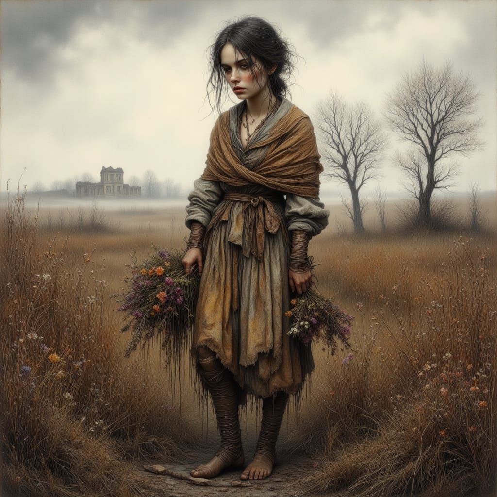 This haunting oil painting depicts a young, melancholic flower seller standing alone on a desolate, windswept moor, surrounded by sparse trees and withered grass, with a ruined abbey faintly visible in the distance through the mist.
