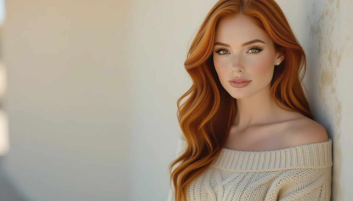 A full body portrait of a young, tanned ginger woman with amber eyes and striking hair. Captured in a cinematic style with film grain and dramatic lighting.