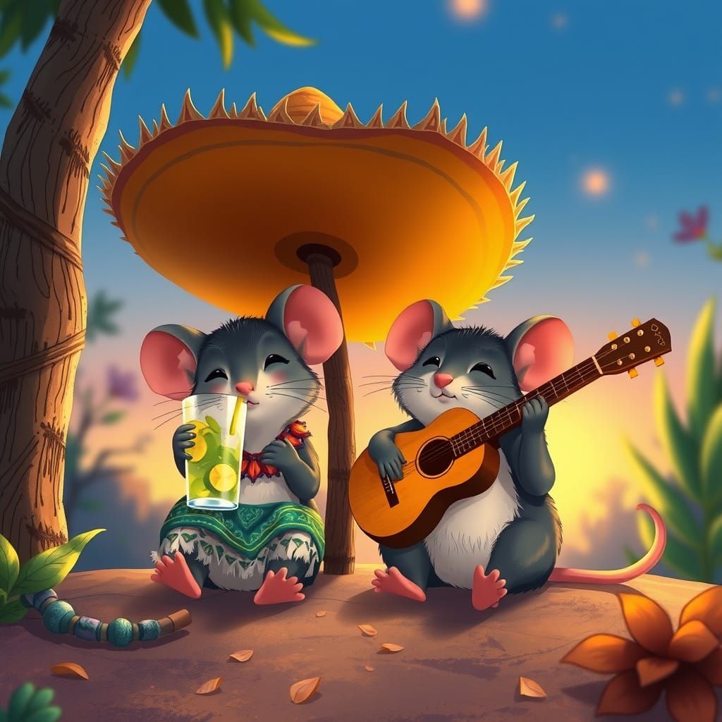 A vibrant image depicting two small Mexican mice enjoying a festive moment. One sips a mojito, while the other enthusiastically plays the guitar, all rendered in a cute, detailed illustrative style reminiscent of anime.