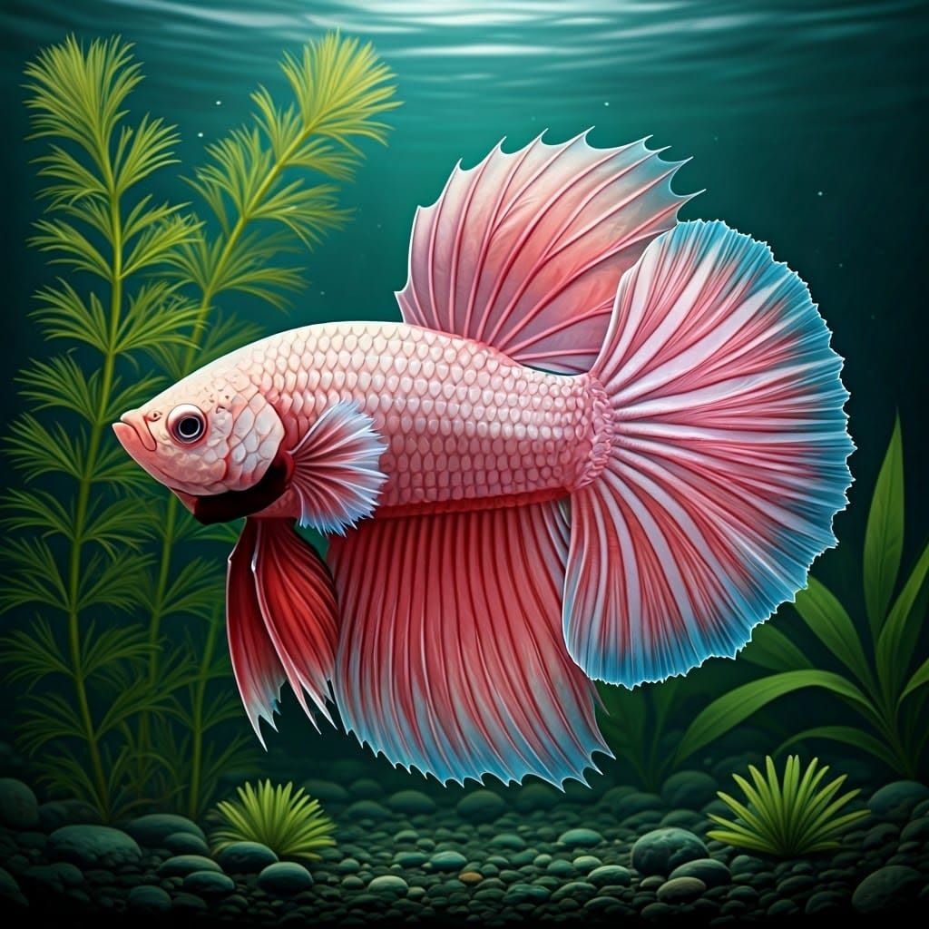 This image showcases a pink betta fish in its underwater environment, surrounded by lush aquatic plants, with detailed scales and fins rendered in a style reminiscent of scientific zoological illustrations, featuring precise depictions and vibrant colors.