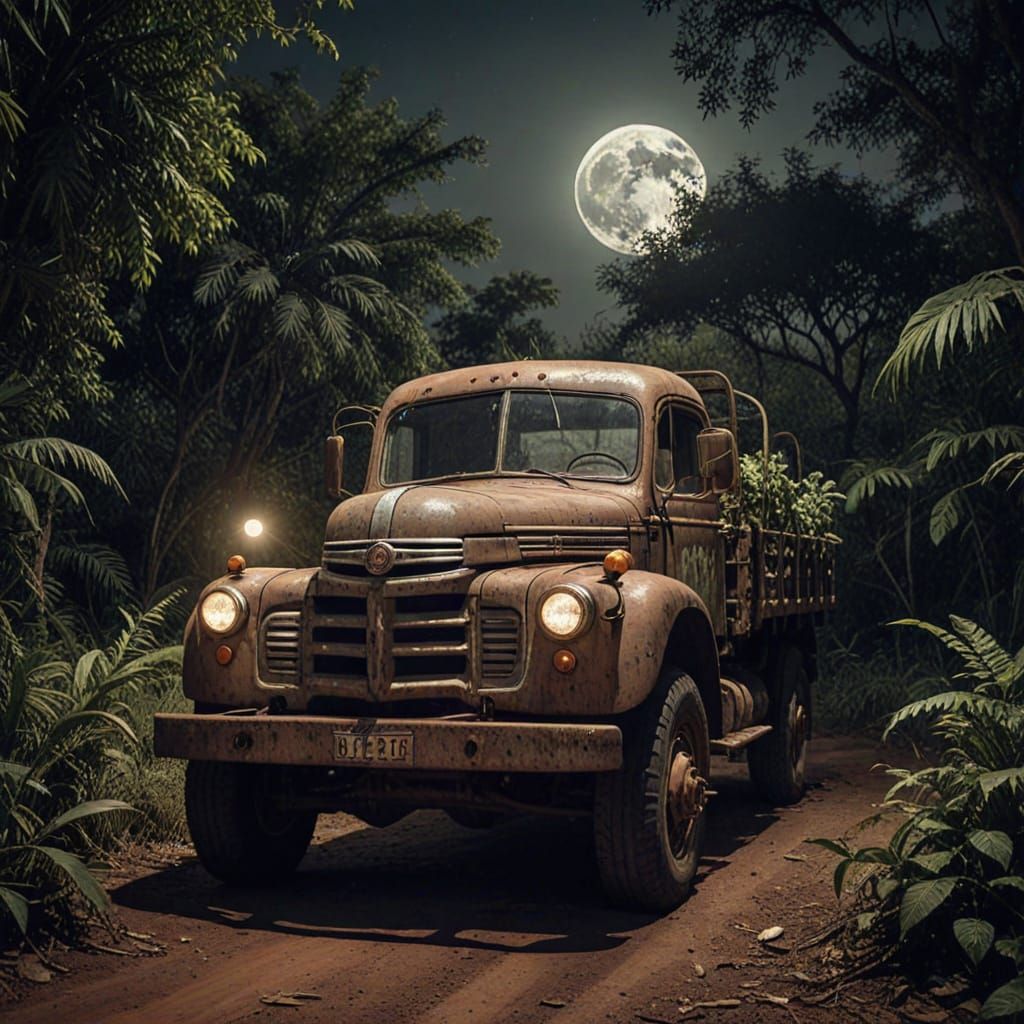 This surreal image captures an abandoned vintage truck in a moonlit African jungle. Eerie, desaturated photography highlights rust and shadows, creating a haunting, atmospheric scene.