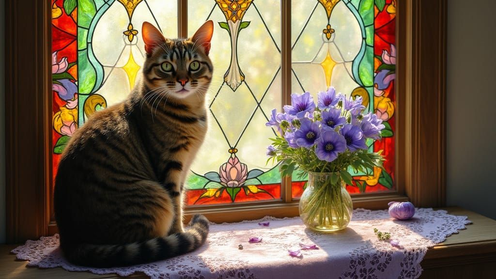 This image features an elegant tabby cat sitting on a windowsill, with a colorful stain glass window behind. An ornate table with a lilac tablecloth and poppies is below, bathed in warm light.