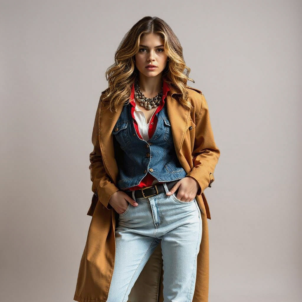 model in a dynamic pose against a gray background. She is wearing a layered outfit: a long tan trench coat, a denim vest, a white shirt with red accents, light-wash denim jeans, and a chunky, layered necklace. Her hair is styled in loose waves. Art style: fashion photography, magazine cover, editorial, modern, stylish, high-fashion, bright lighting, even lighting, 8k resolution, photorealistic.