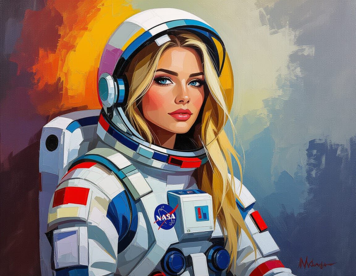 This image shows a woman with long blonde hair wearing a spacesuit. The artwork features an expressionist, neo-impressionistic style and heavy impasto texture with thick layers of colorful paint.