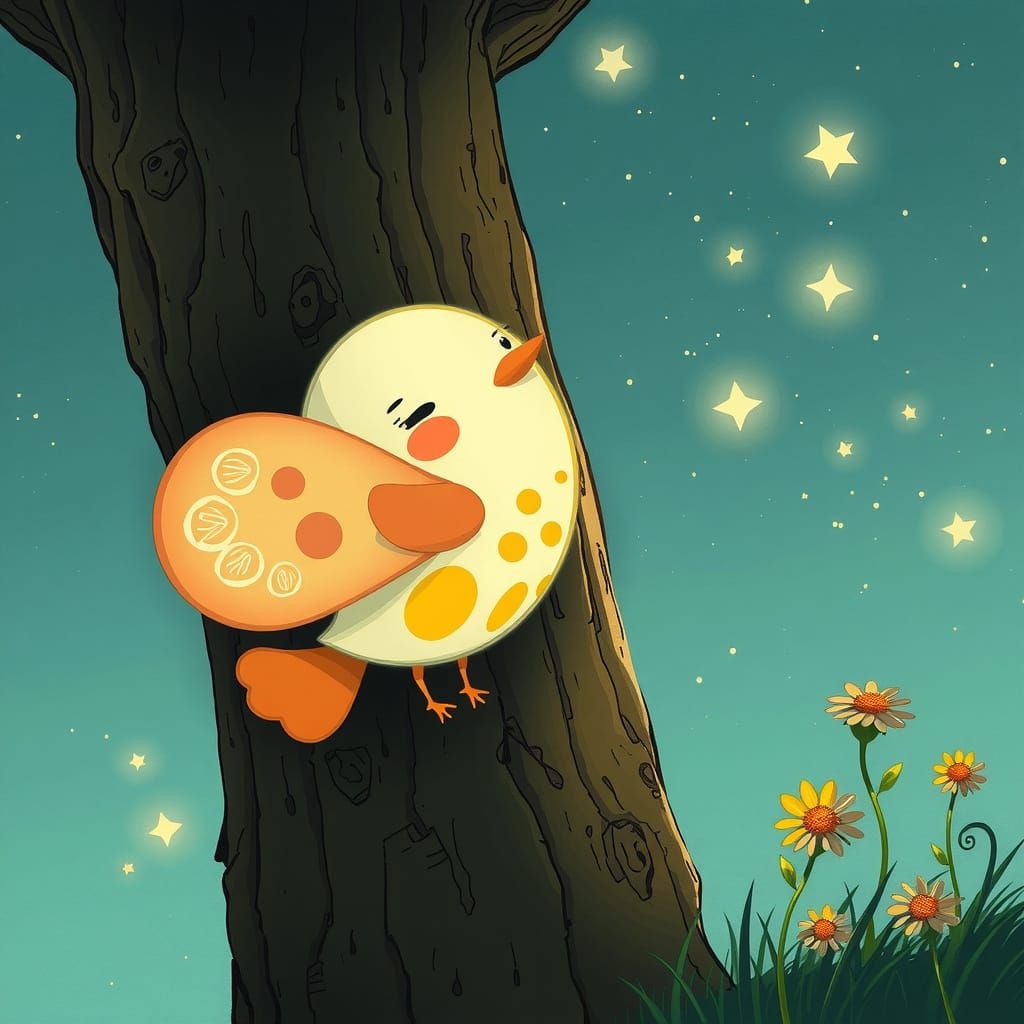 A digital painting of a butterfly bumping into a tree trunk and seeing stars. The mixed art style evokes organic textures and pastel shades in a whimsical, cartoon-like aesthetic.