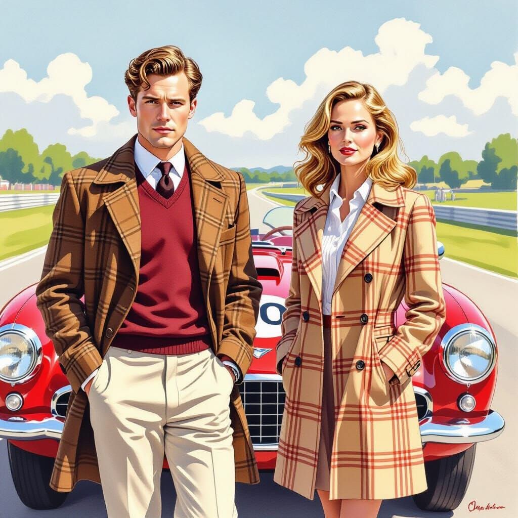This artwork showcases a couple in an outdoor setting with a race car theme, rendered in a watercolor and colored pencil style. It features a classic red race car and a sunny day ambiance.