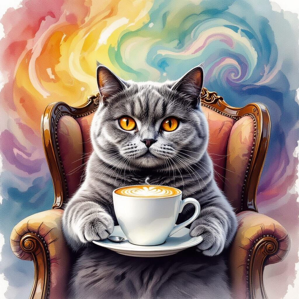 This image shows a majestic grey British Shorthair cat with orange eyes on a vintage chair, enjoying a cappuccino. Features a vibrant, swirling rainbow background, created with watercolor ink techniques.