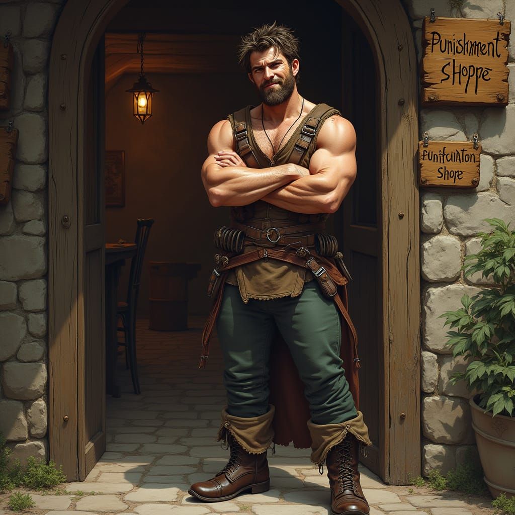 A medieval man muscular, shirtless wearing a thought leather vest with straps, clingy wool tights, cuffed boots, stubble, tousled hair, stubble on his strong jaw. He stands in the middle of the shop with his arms folded across his chest, looking at the viewer. He stands on a medieval street outside a ...