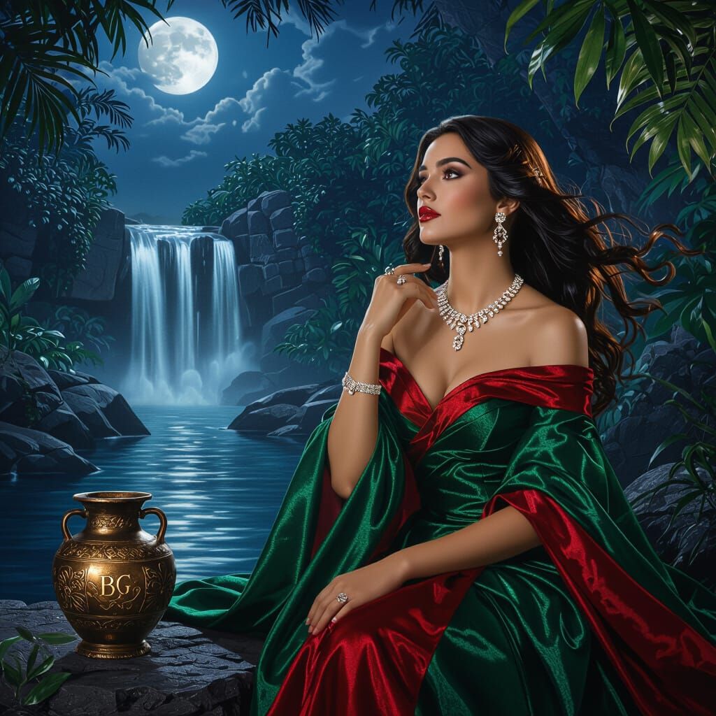 Mulher luxuosa em vestido esmeralda e vermelho, joias finas com “BG”, colar e brinco. Olhar perdido, saudade profunda. Fundo noturno em selva tropical com cachoeira iluminada pela lua, sombras suaves sobre pedras e folhas. Um vaso antigo gravado “BG” repousa próximo, iluminado suavemente. Tecidos e cabelos ...