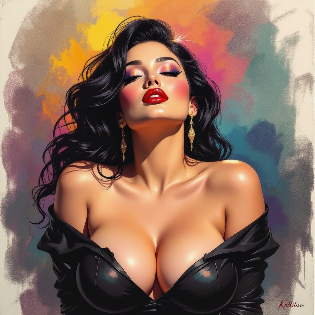 This hyperdetailed charcoal drawing features a woman with wet, colorful hair and a sultry expression. Dramatic lighting enhances her form against a vibrant, abstract background.