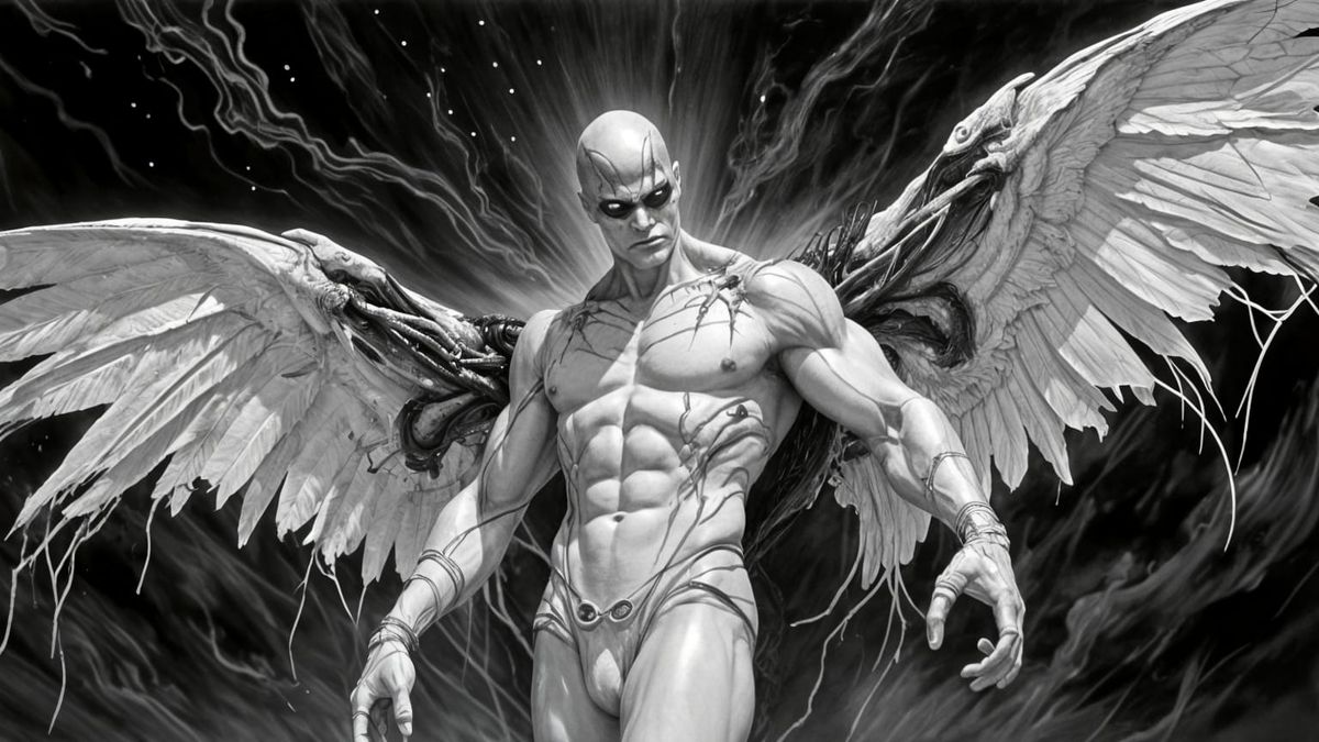 This image depicts a powerful, disfigured female cyborg with black compound eyes, rendered in a stark, black and white acrylic wet wash style. The background is a surreal, horrific abattoir, emphasizing cosmic struggle.