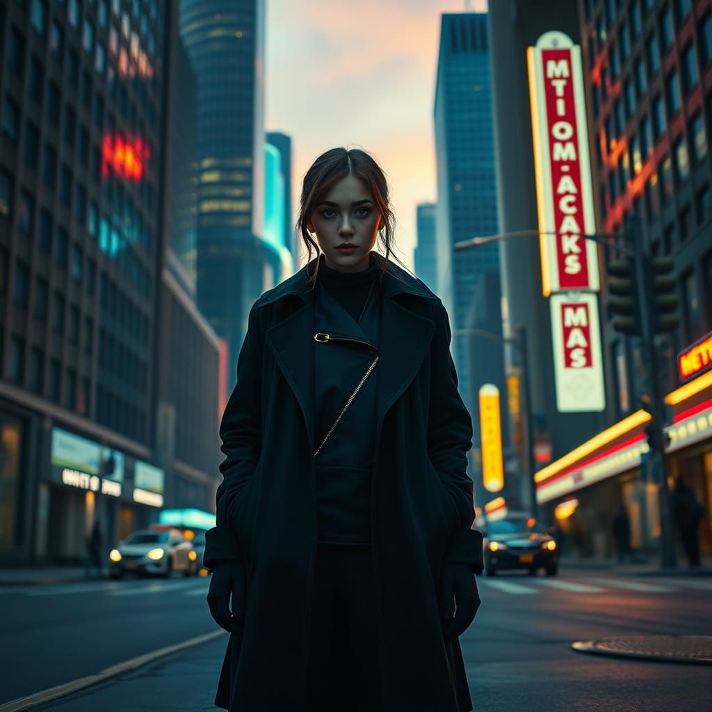A young woman with a mysterious aura stands at the edge of a bustling city, surrounded by towering skyscrapers and neon lights, in a moody, cinematic atmosphere reminiscent of Syd Mead and Ash Thorp's work.