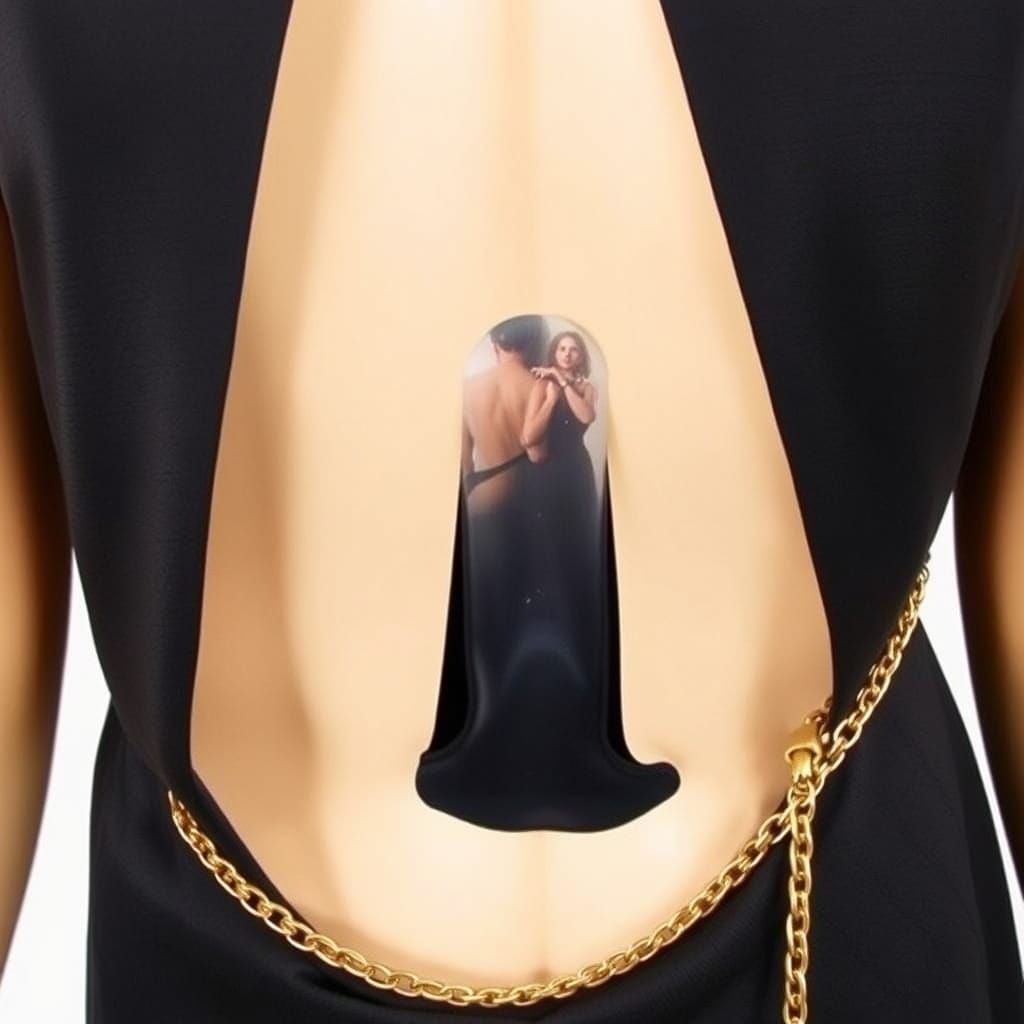 This image shows a stunning black satin evening gown with a thigh-high slit, deep V-neckline, and backless design, finished with a gold chain belt at the waist, creating a sophisticated and glamorous look.