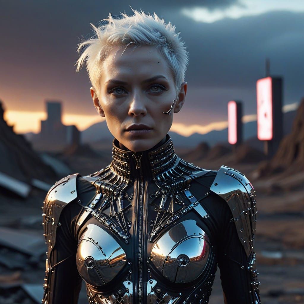 A striking picture of an older woman in futuristic clothing against a desolate backdrop. The avant-garde fashion, crafted from recycled tech and neon, merges cyberpunk with high-fashion aesthetics.