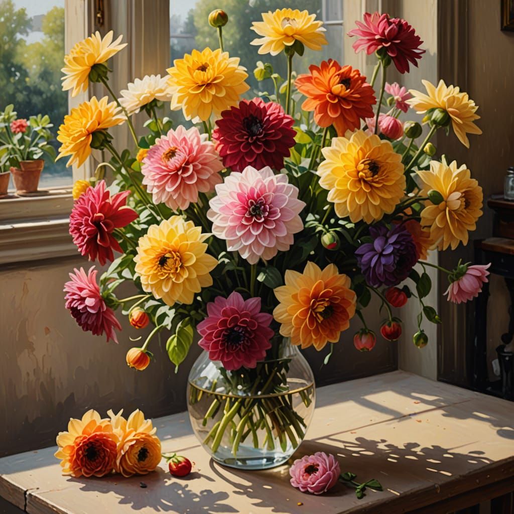 A striking picture of a florist's shop filled with vibrant flowers. The image captures the beauty of Dahlias, Sweet Peas, and Ranunculus in the style of impressionist oil painting.