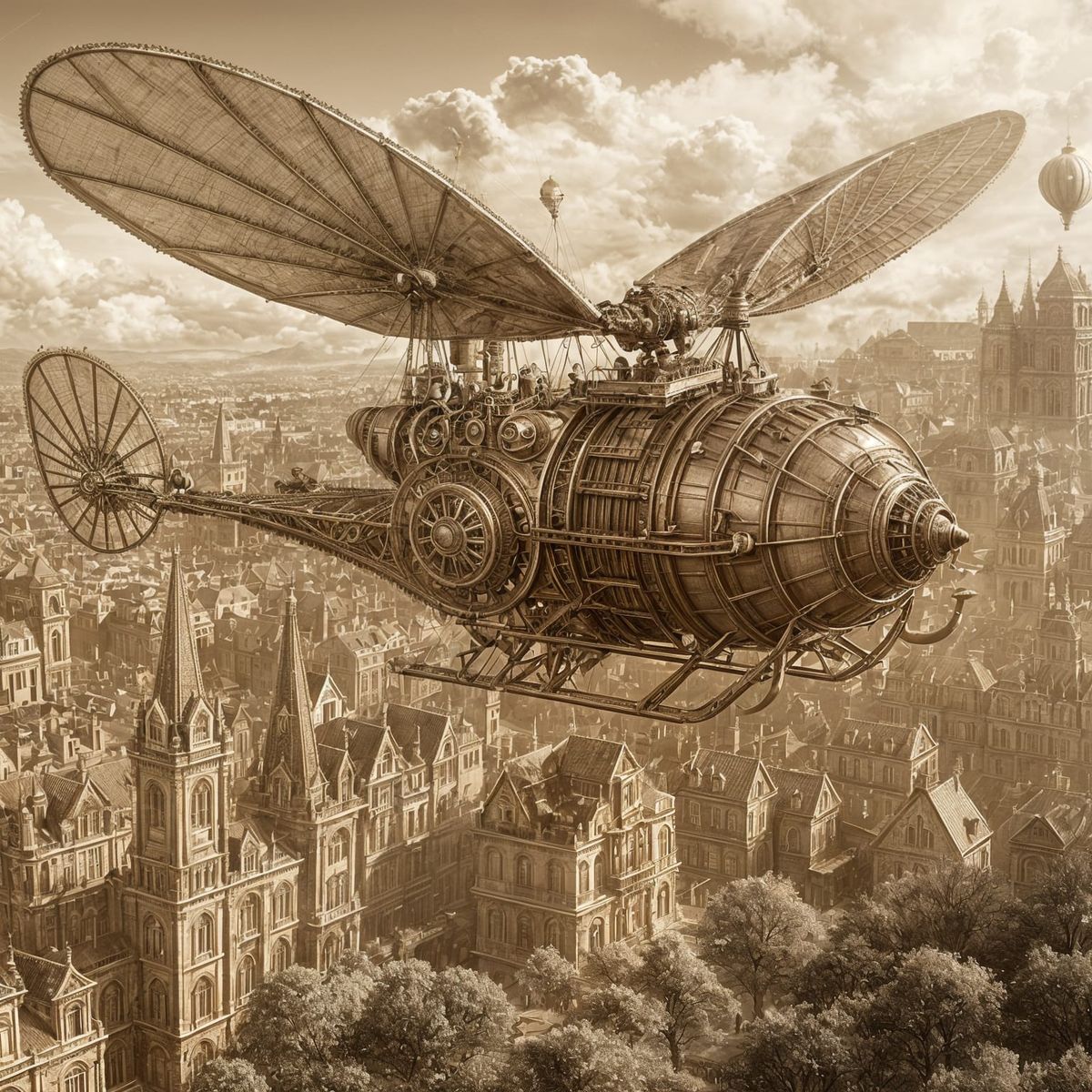 This image shows a steampunk ornithopter flying over a Victorian city. The pencil sketch aesthetic uses sepia tones, soft lighting, and dramatic atmospheric perspective to create an intricate scene.