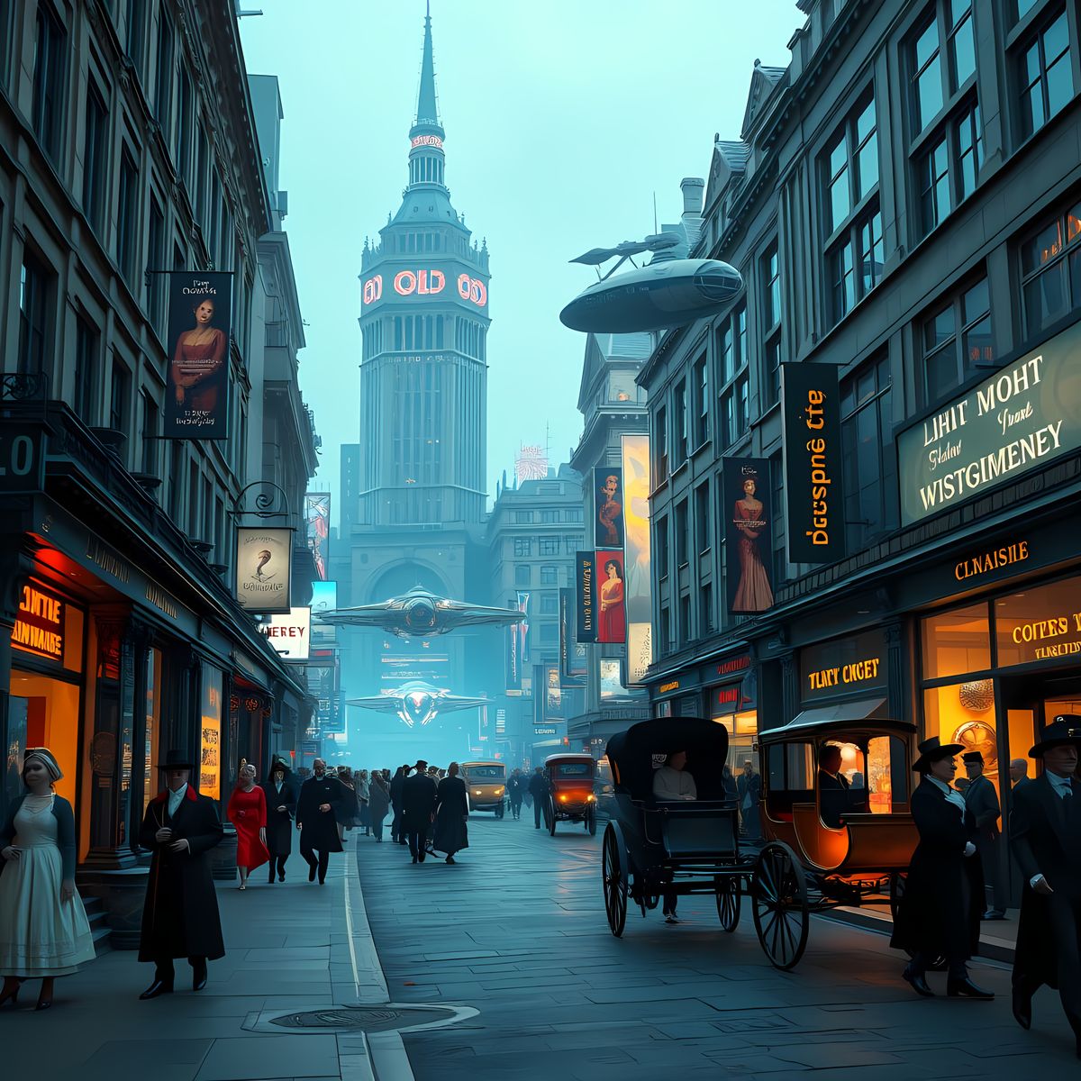 This image shows a photorealistic street scene blending futuristic and 18th-century elements. People dressed in Victorian attire populate a London street with otherworldly objects in a hyperrealistic style.