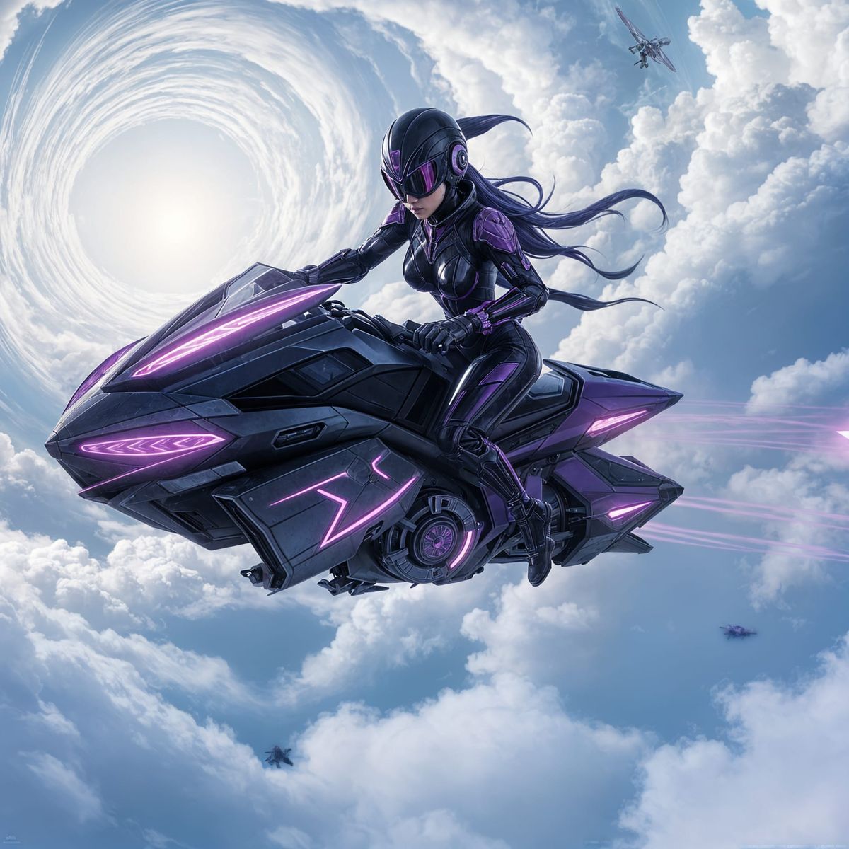 A female Psycho Ranger soars on a hoverbike through swirling clouds and mist. A distant cityscape provides a backdrop to this anime-inspired 3D rendering with detailed textures and metallic reflections.