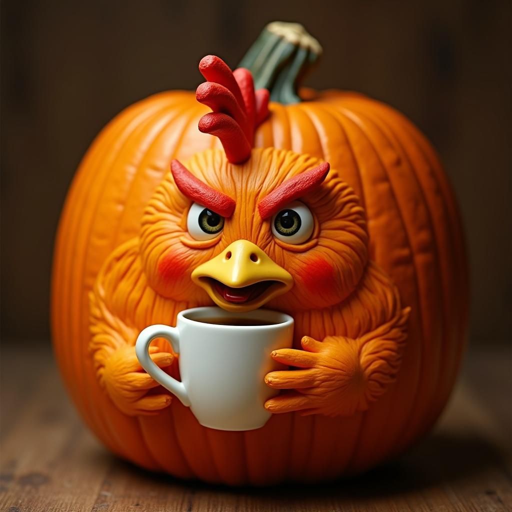 This image shows a pumpkin carving of a disgruntled chicken enjoying a cup of coffee. The whimsical image combines autumnal and humorous themes.