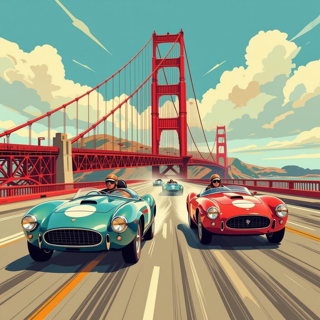 A dynamic illustration of vintage cars racing across the Golden Gate Bridge, featuring drivers in classic attire, rendered with vibrant colors and bold brushstrokes.