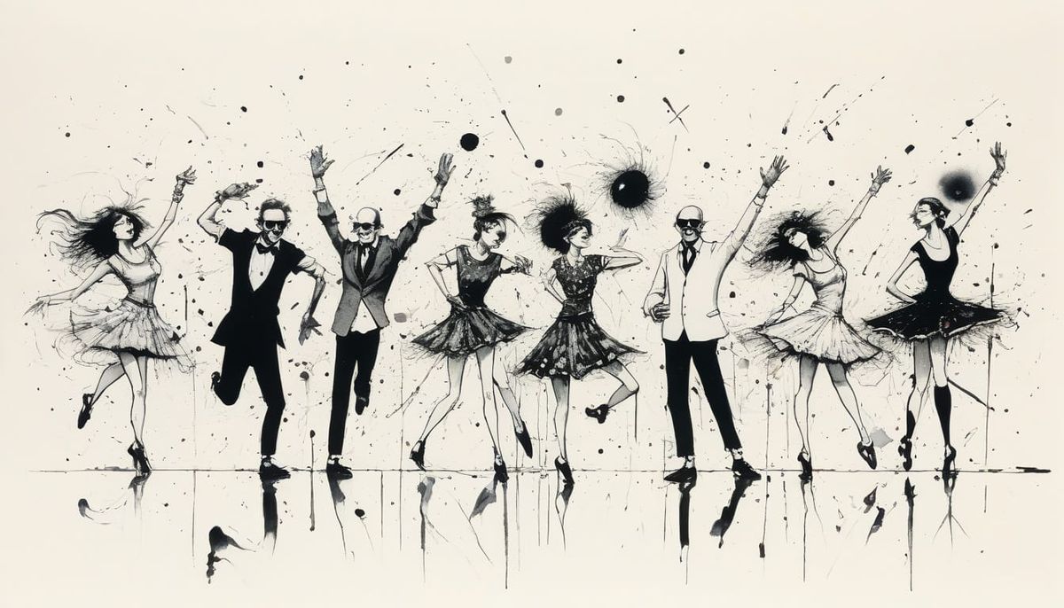 This image depicts abstracted dancers in a minimalist surrealist aesthetic, blending figurative and abstract elements in a dreamlike atmosphere.
