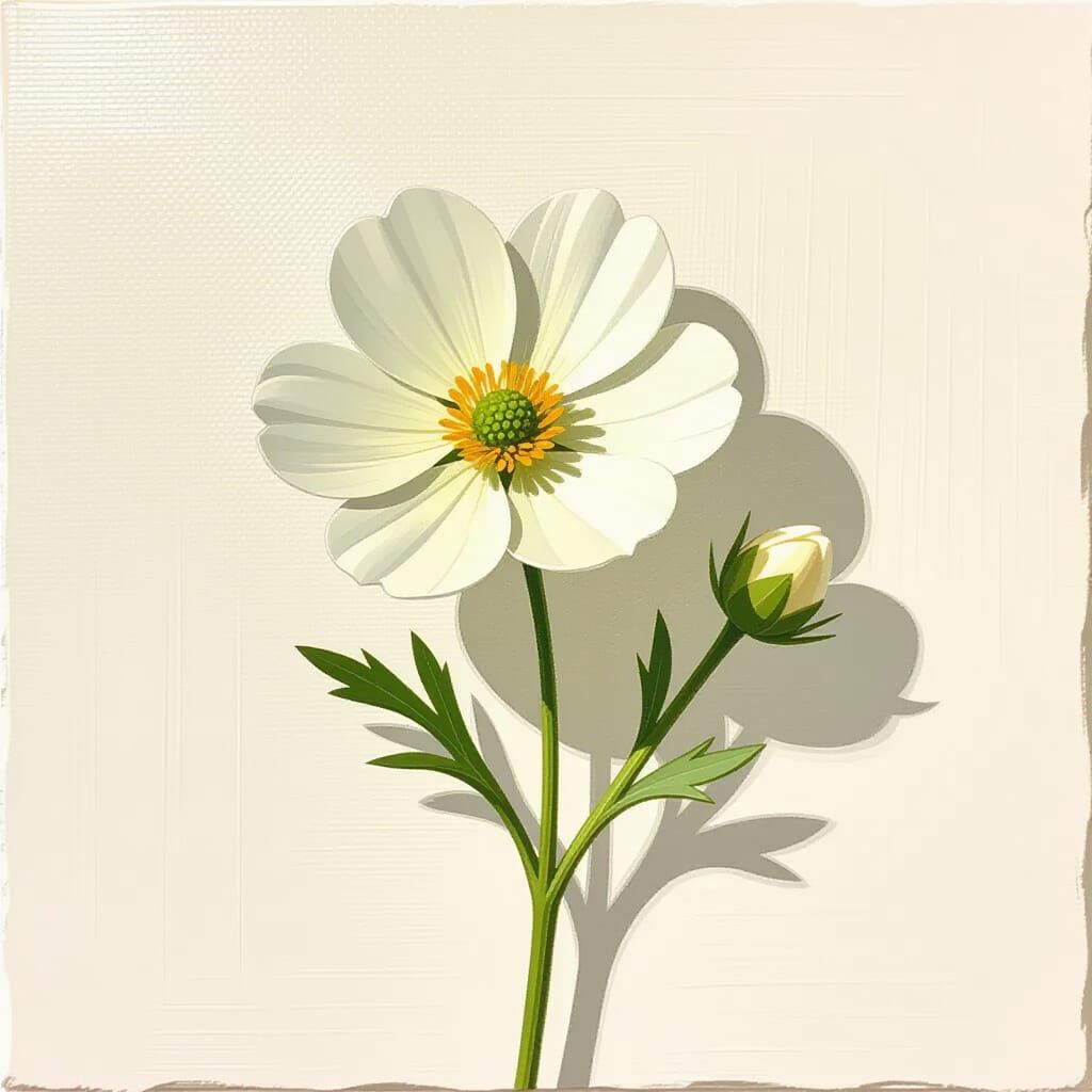 This image showcases a delicate white wildflower with subtle yellow and green hues, rendered in thick, textured oil paint. The minimalist composition features serene, muted tones under soft, diffused light.