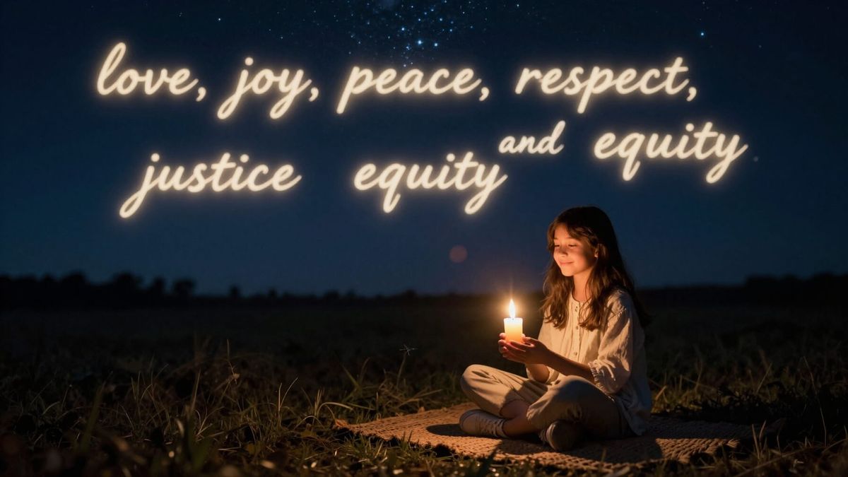 This ultra-realistic image shows a girl sitting in a field at midnight under a sky filled with glowing words for peace and love. Captured with cinematic lighting and bokeh effect.