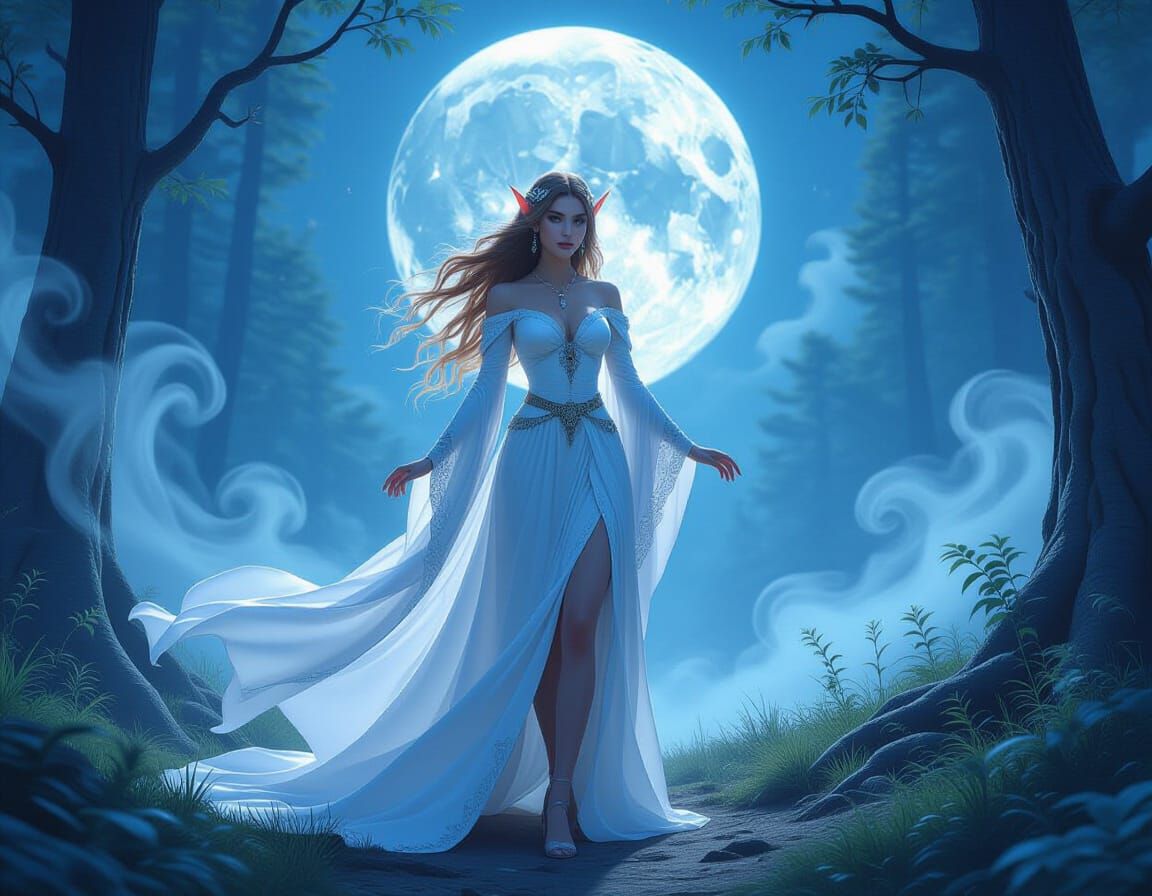 This image depicts a hyperdetailed fantasy scene of a beautiful elf sorceress in a white gown, calling ancient goddesses in a mist-filled forest clearing under moonlight. Rendered in a concept art style with dramatic lighting and cool, warm color contrasts.