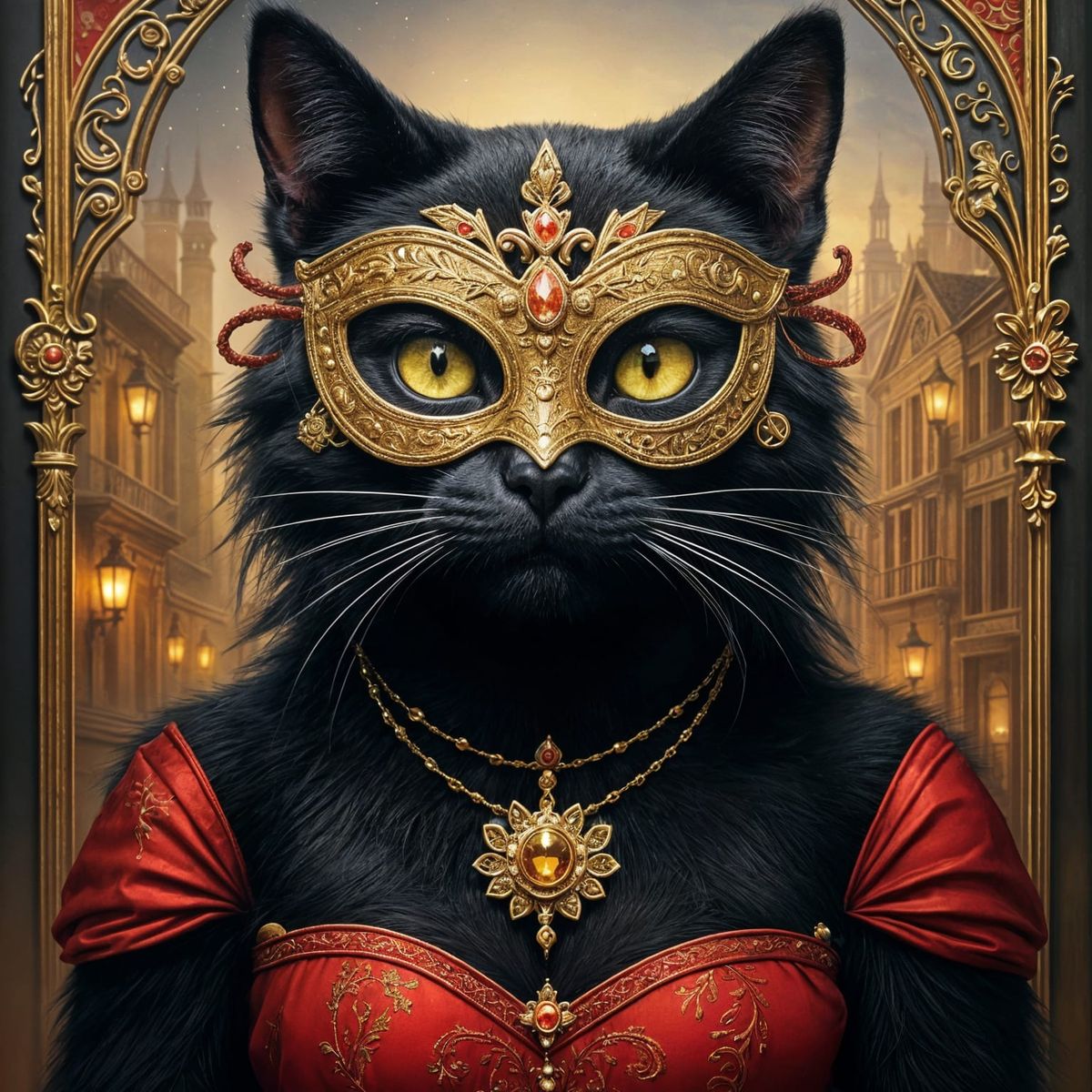 This AI-generated image features an anthropomorphic black cat with gold eyes, wearing a jeweled red mask and bodice. Set against a city square at dusk, it's rendered in a rich gouache and watercolor style with textured brush strokes.