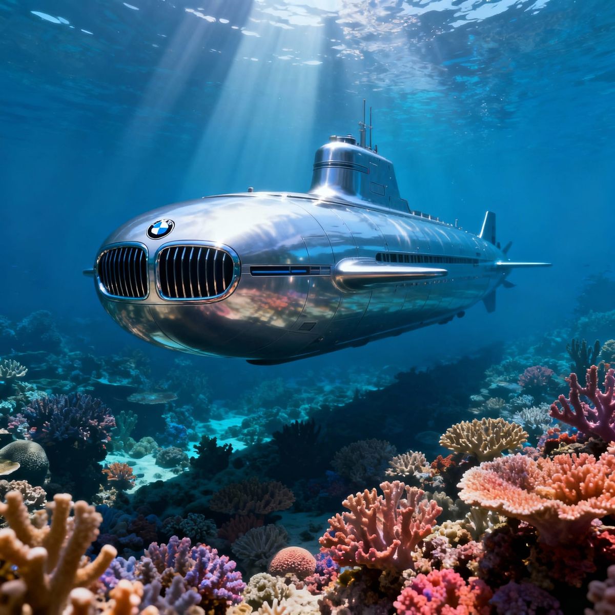 This image shows a hyperrealistic 3D digital artwork of a silver BMW submarine with its kidney grille, exploring a vibrant, animal-free coral reef bathed in dramatic sunlight.