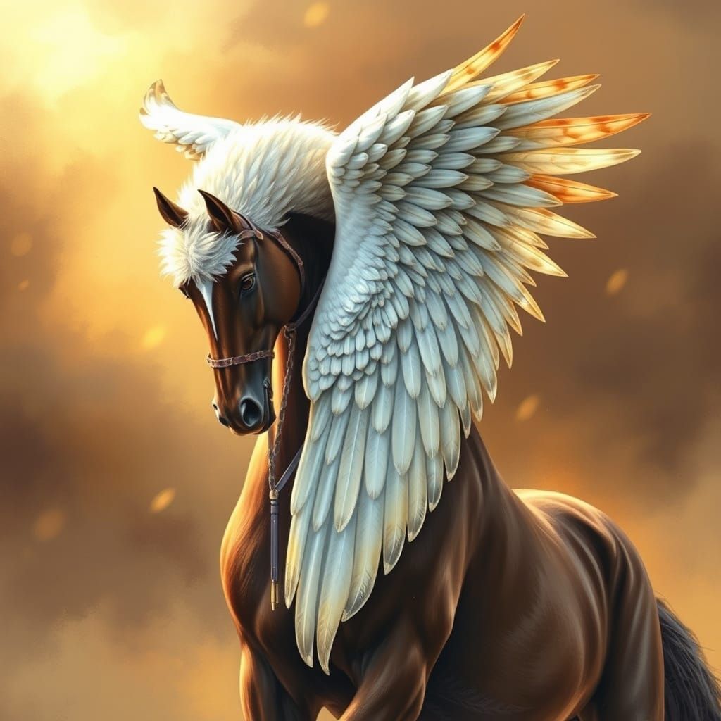 This image depicts a dignified chimera, with the body of a horse and the head and wings of an eagle, set against a warm golden light. The creature's dark brown coat and snowy white feathers evoke a sense of elegance and power.