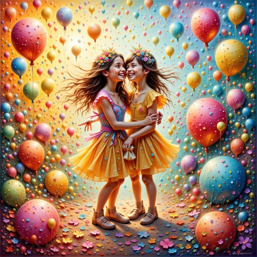 This image shows a vibrant, impressionistic painting of a happy birthday celebration. Featuring a smiling sister surrounded by colorful decorations, rendered with thick brushstrokes and warm, golden hour light.