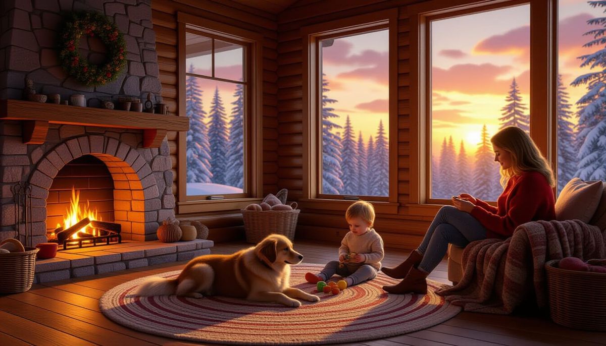 This image shows a family scene inside a cabin at sunset. A dog, toddler, and mother are enjoying a peaceful moment in a cozy living room with a fireplace, windows, and a view of a vibrant summer forest, as a digital matte painting.