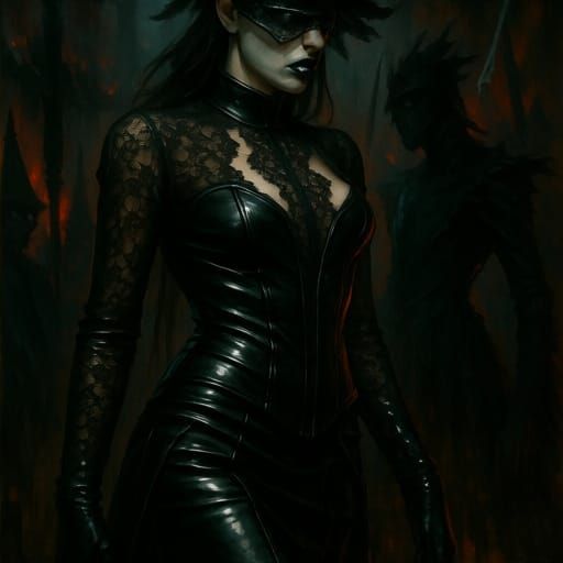 This image showcases a clandestine fashion rebellion with avant-garde latex and leather outfits contrasted with dark lace, presented in a dramatic, painterly digital art style with stark highlights and deep shadows.