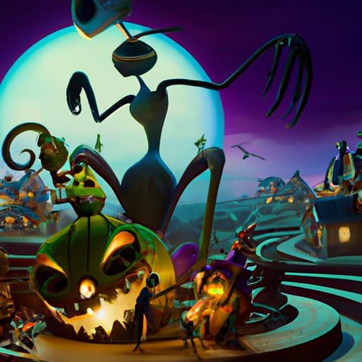 This image shows a vibrant 3D render of Halloween Town from The Nightmare Before Christmas. The scene is brightly colored with a radial gradient background, reminiscent of a Pixar or Disney concept art.