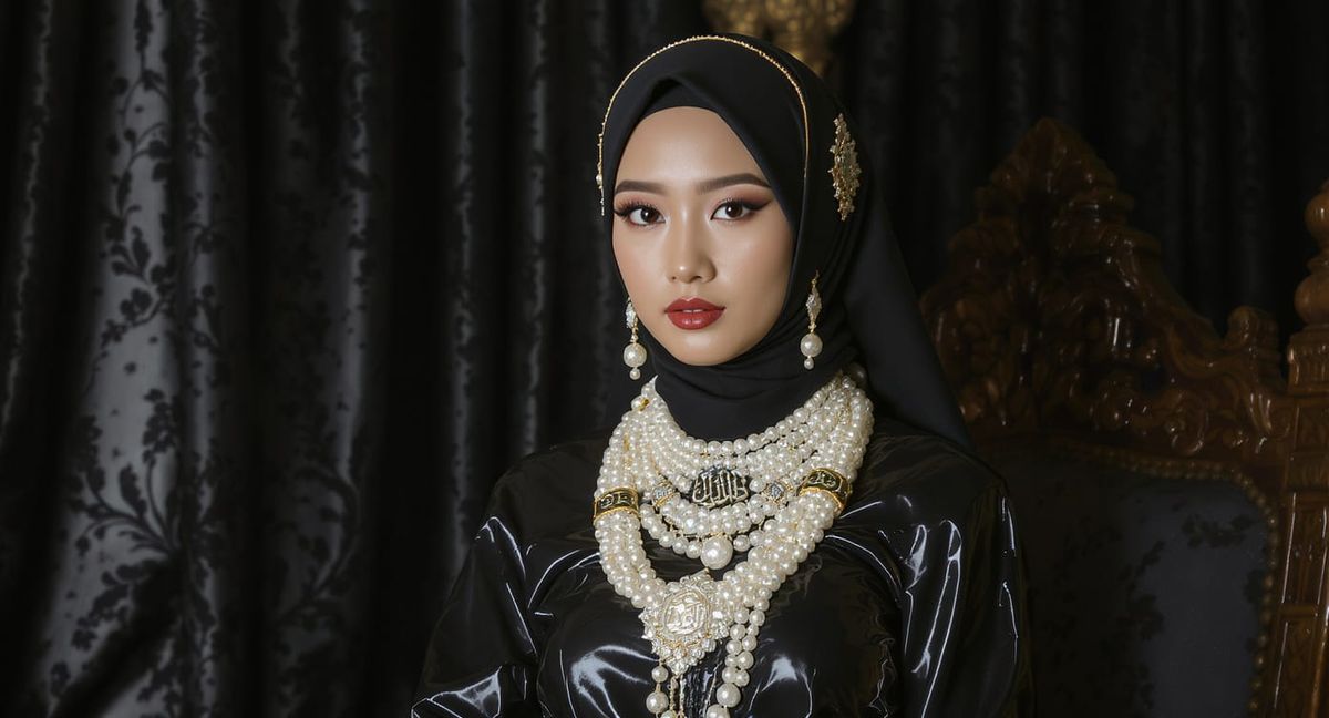 This image features an Asian woman in a hijab and shiny latex attire, adorned with a pearl body chain and Quran necklace. The style is elegant, modest, and features intricate details with subtle lighting.