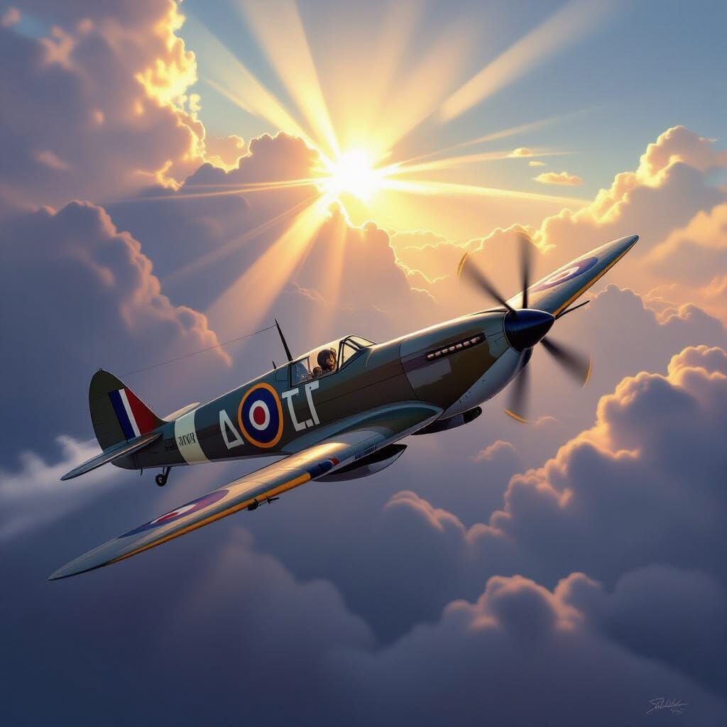 A vintage Spitfire fighter plane soars through a dramatic sky, illuminated by sunlight filtering through clouds. Rendered in an epic concept art style with atmospheric lighting and vivid colors.