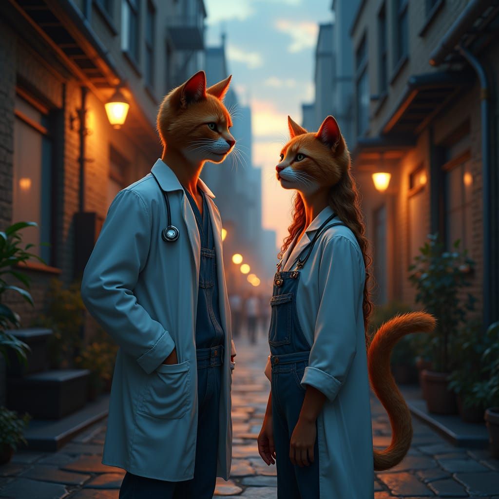 A poignant scene of a hardworking red cat's disappointment as his wife, now a doctor, rejects him for a suave colleague in a bustling city at dusk, blending photorealism and fantasy