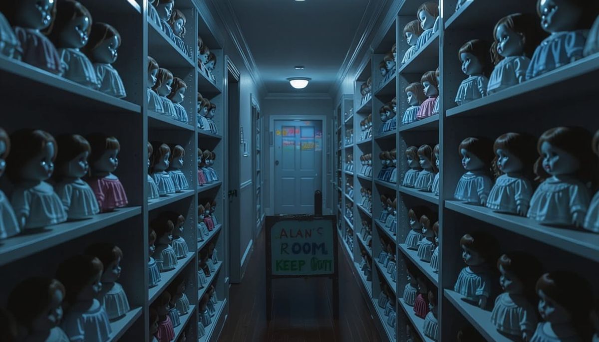 This image shows a deeply unsettling, narrow residential hallway packed with unique porcelain dolls on shelves. The photorealistic horror style creates intense psychological tension and creepy realism.