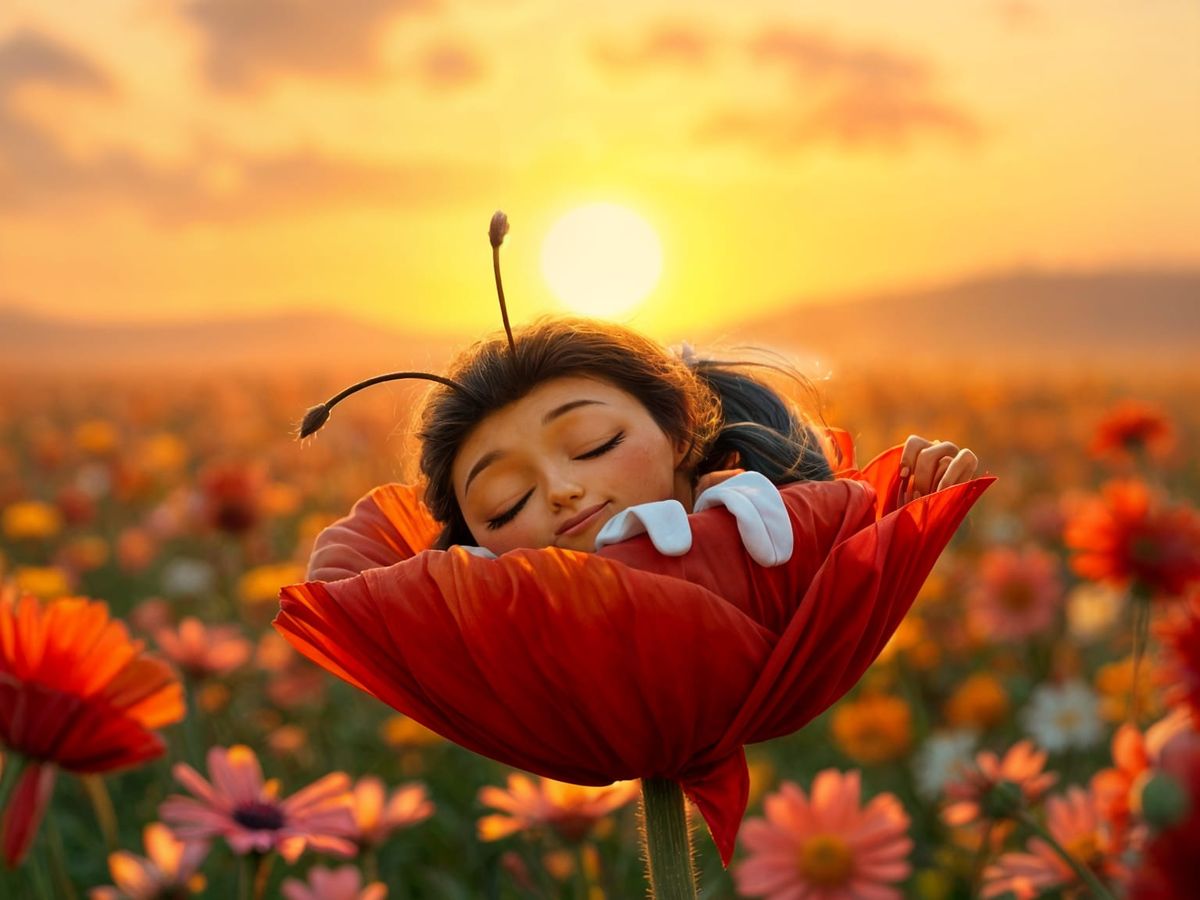 This image shows an anthropomorphic bumblebee wearing white gloves asleep inside a vivid red poppy. Soft morning sunlight illuminates the scene, with a blurred wildflower field backdrop in a Disney/Pixar animation style.