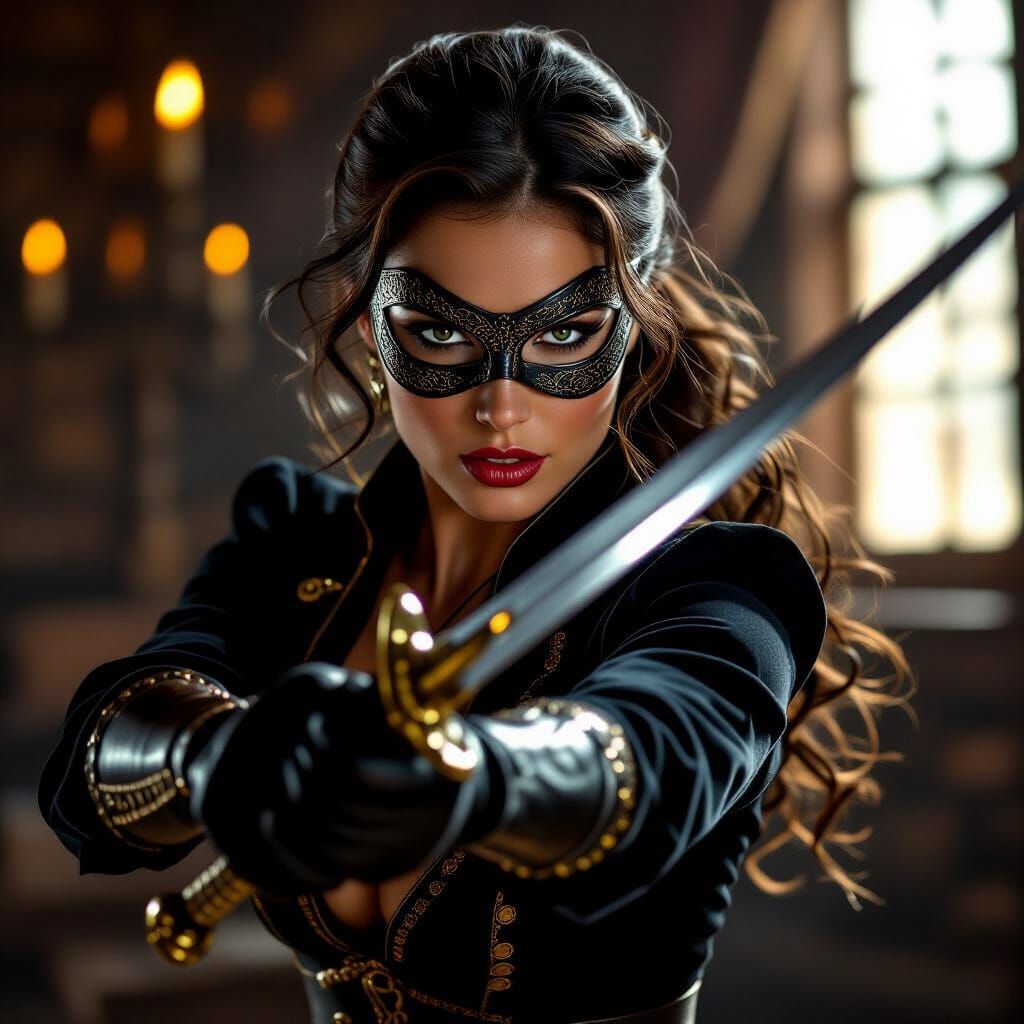 A striking, high-resolution image of a beautiful swashbuckler woman in mid-action with a rapier. Dramatic lighting and cinematic effects enhance the adventurous scene.