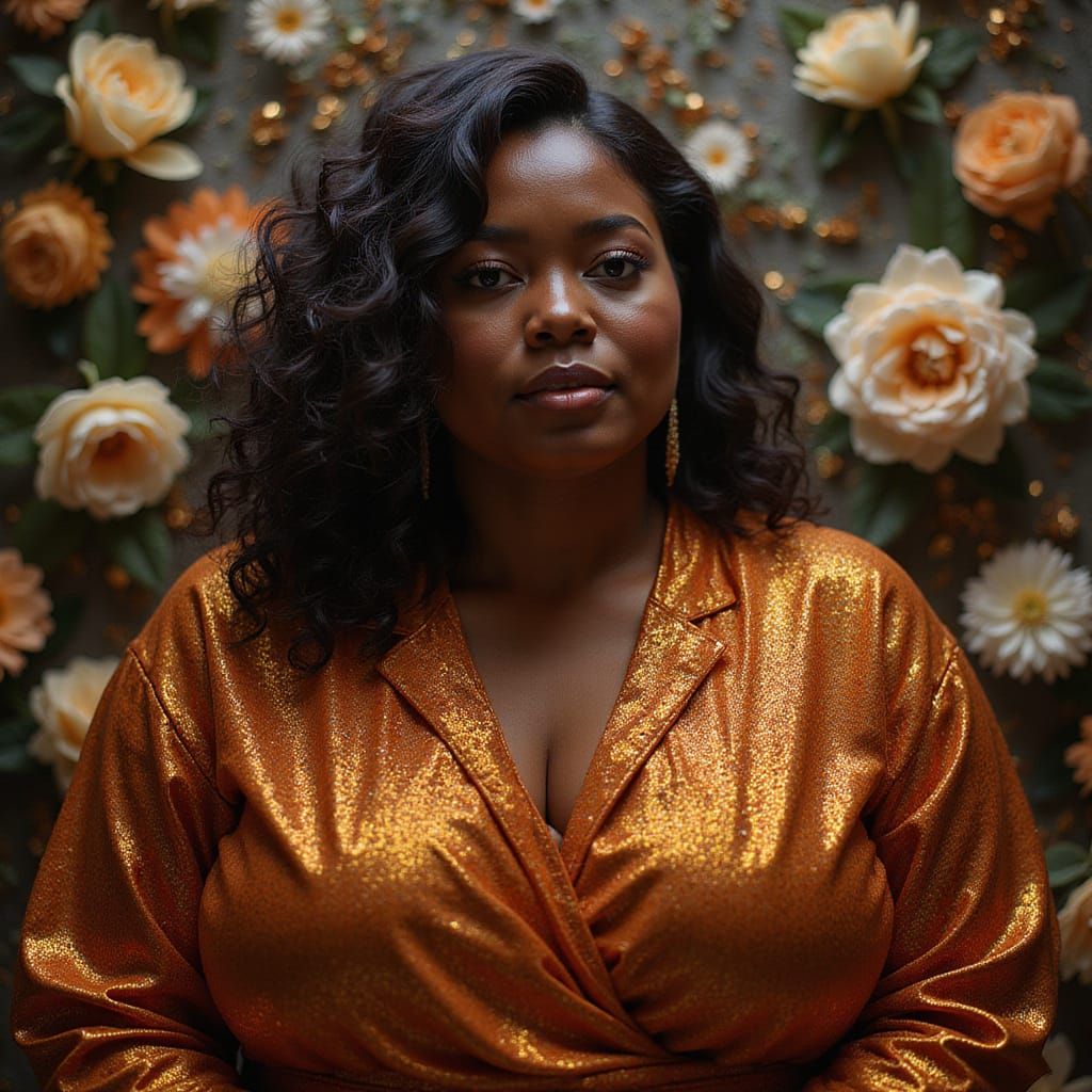 A striking picture of a plus-sized African American woman radiating devotion. The image features surreal blooms and molten foil with dynamic, volumetric lighting, creating a reverent and elegant scene.