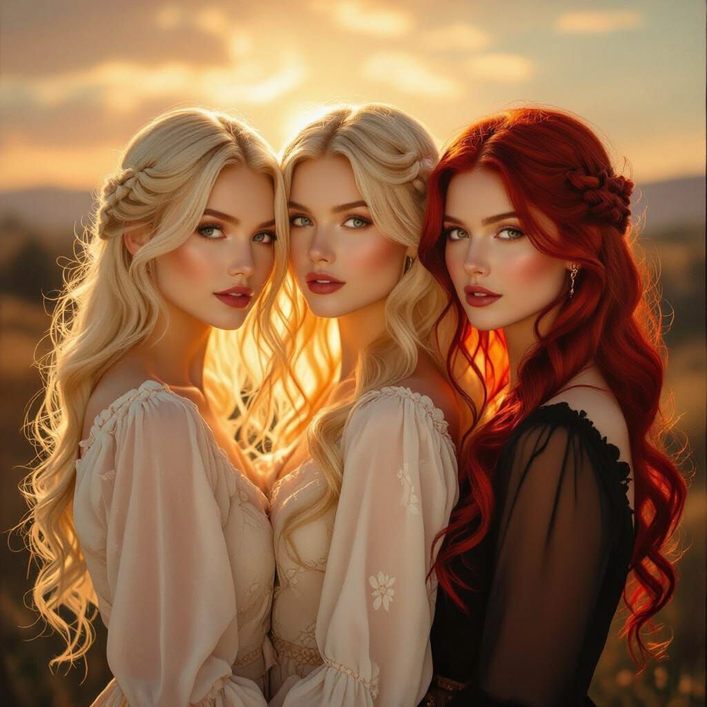 This image shows women with blonde and red hair bathed in dramatic, contrasting light, reminiscent of Pre-Raphaelite art with flowing clothing and a moody landscape.