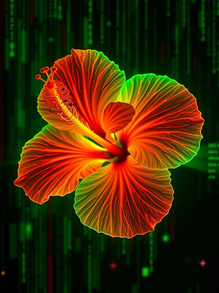 A vibrant neon light painting of a double-corolla hibiscus. The image features a glitch effect and matrix code, rendered as neon bio art.