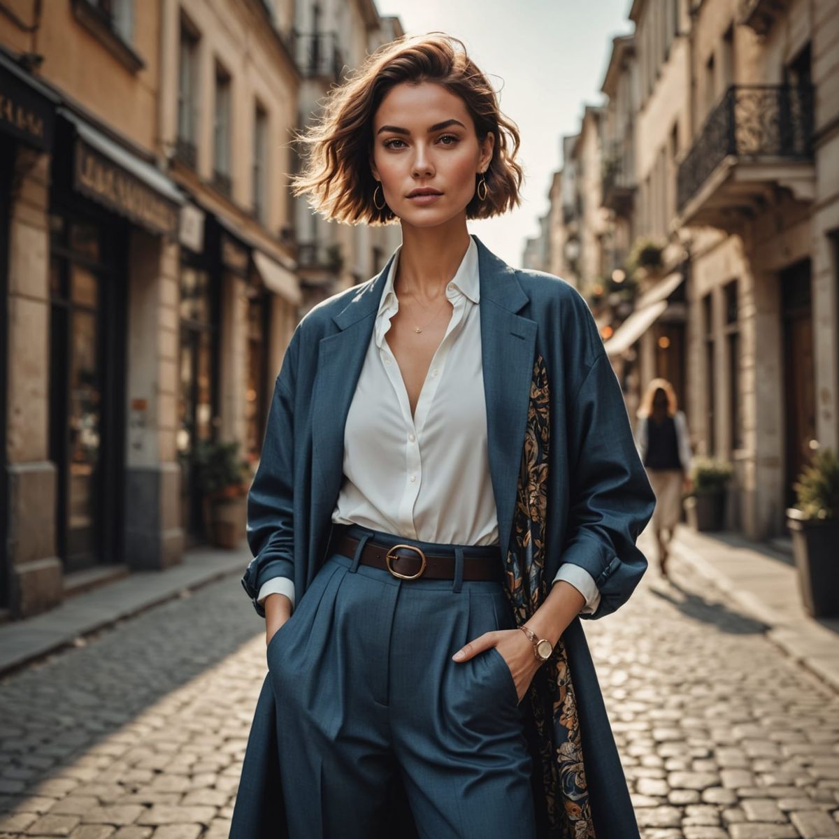 A digital fashion illustration of a stylish woman confidently posing. The high-detail image showcases various outfits, detailed fabric textures, and fashionable accessories in soft lighting.