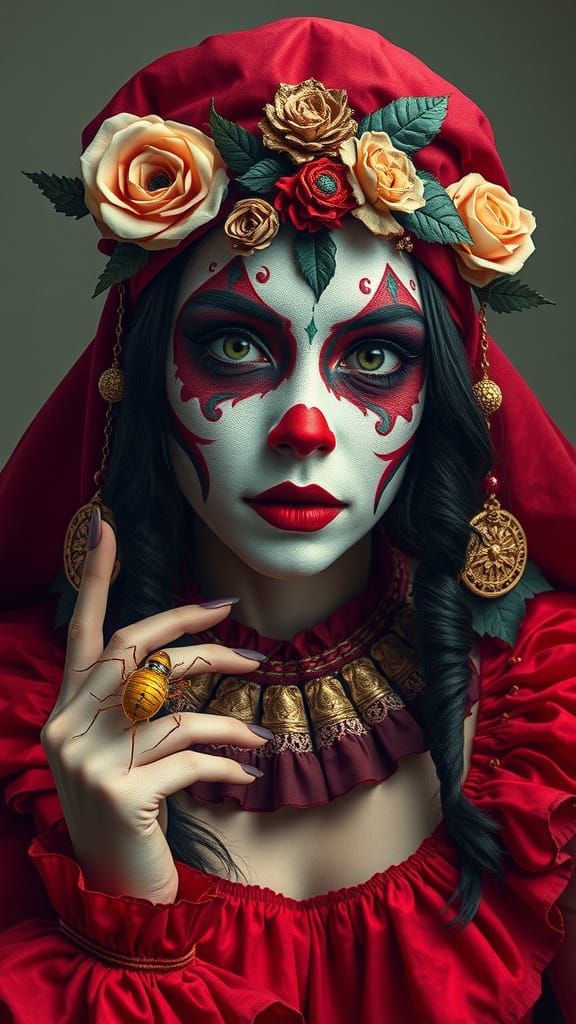 This image shows a woman in elaborate clown makeup, posing with a malaria parasite. The artwork has a photorealistic quality and a gouache painting texture, with bio oro accents. A vibrant and intricate scene.