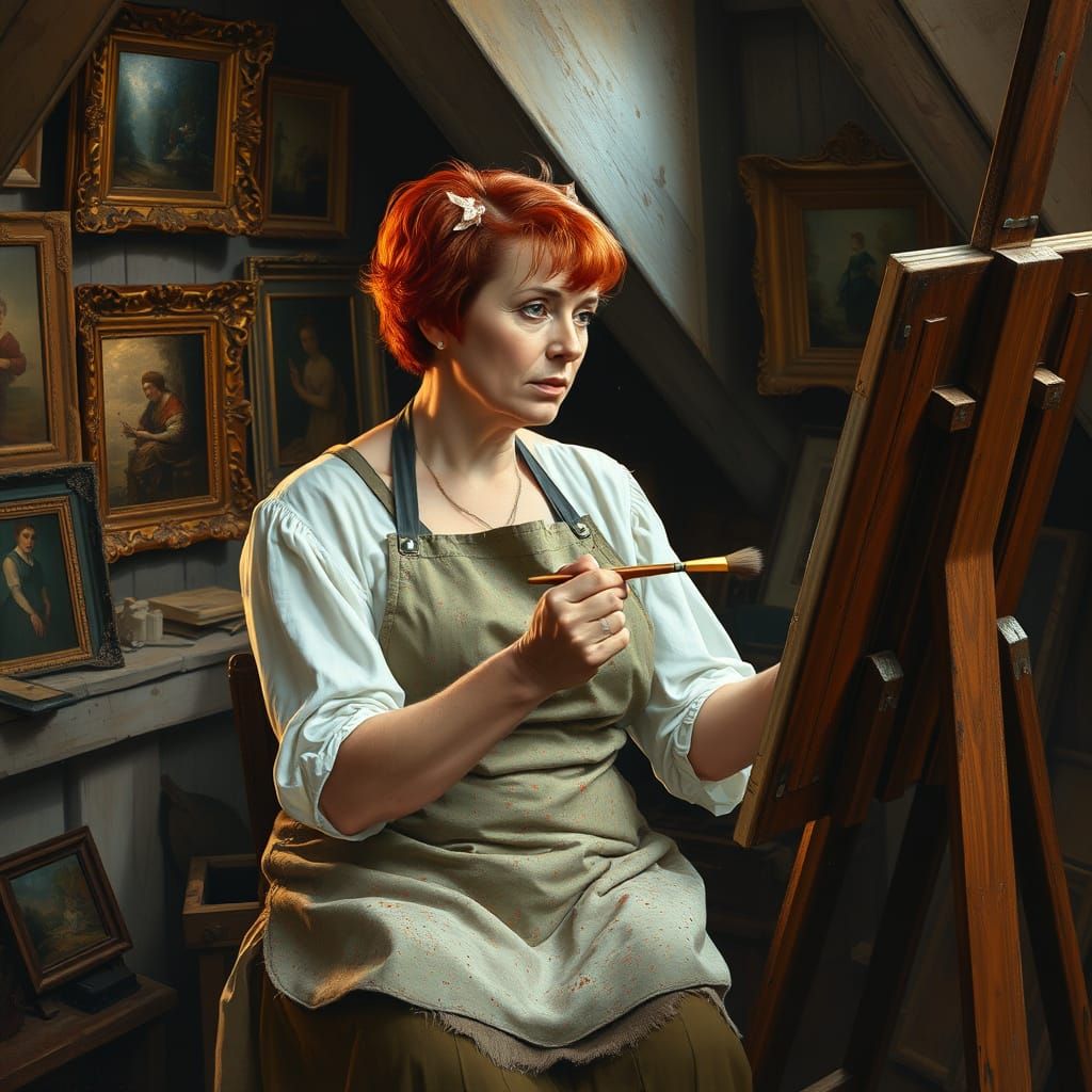This image shows a middle-aged woman in a studio-like setting, surrounded by old paintings and soft light, capturing the essence of domestic scenes reminiscent of Wyeth, Cassatt, and Vermeer with a touch of Pre-Raphaelite ethereal quality
